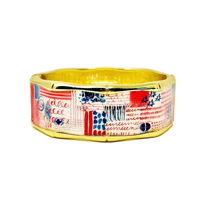 The amazing original watercolor art of Grey Hall Design is now featured on this gorgeous, patriotic bangle. Originally designed by Grey Hall as part of their luxurious line of silk scarves, the Abstract American Flag bangle is part of a collaboration with a jewelry manufacturer - and we are fortunate enough to have it in our boutique, and just in time for America's 250th!